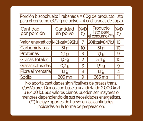 Es una premezcla en polvo lista para preparar bizcochuelo marmolado. Permite obtener bizcochuelos de muy buen volumen, estructura homogénea y levemente aireada. Con cambios en la receta y procesos sirve para elaborar bizcochuelos saborizados, bases para semifríos, pio-nonos, tapas de alfajores, plantillas.