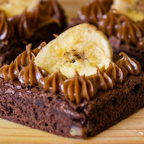 450 gr Premezcla Brownie Fleischmann en Casa 2 huevos 60 gr manteca derretida 15 cc agua 2 bananas 100 gr dulce de leche Jugo de limón