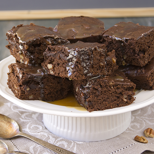 450 gr Premezcla Brownie Fleischmann en Casa 2 huevos 60gr de manteca derretida 15 cc de agua 100 gr nueces 100 gr dulce de leche