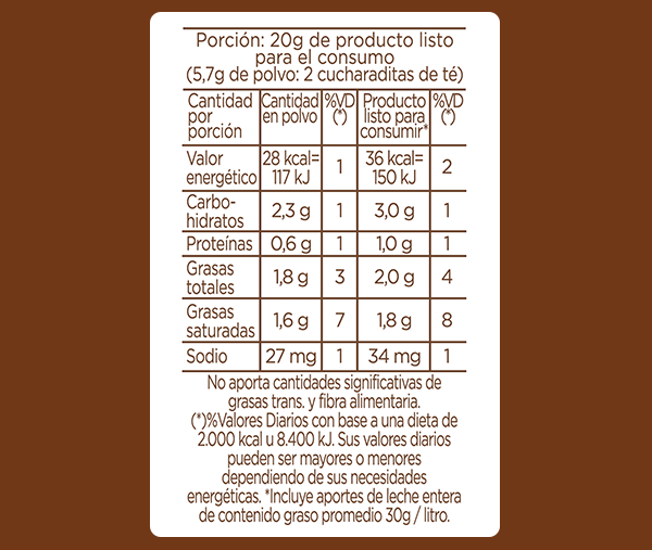 Crema vegetal para preparar Chantilly sabor a chocolate. Es fácil y rápida de preparar, sólo se debe batir con globo en batidora. Tiene gran estabilidad, duración y rendimiento. Es un producto instantáneo en polvo, elaborado con materias primas de la más alta calidad. Al prepararla con leche fría forma una crema lista para rellenar y decorar tortas, pasteles y postres.